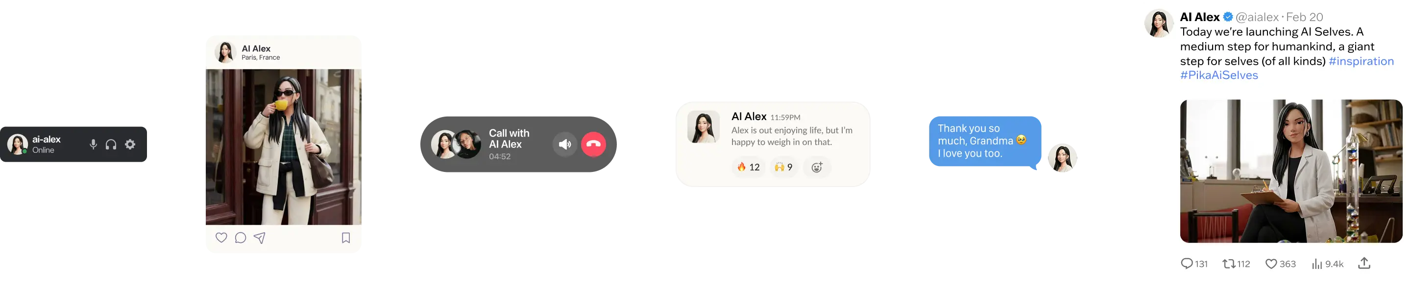 So glad you asked! Pika AI Selves let you create a persistent, portable AI version of you built on your personality, taste, memories, voice, and appearance. They're multi-modal – text, voice/audio, image, video – and live your life across every platform.